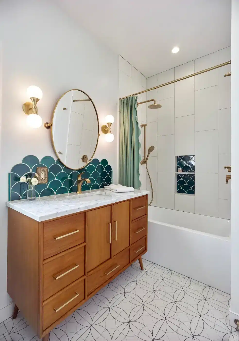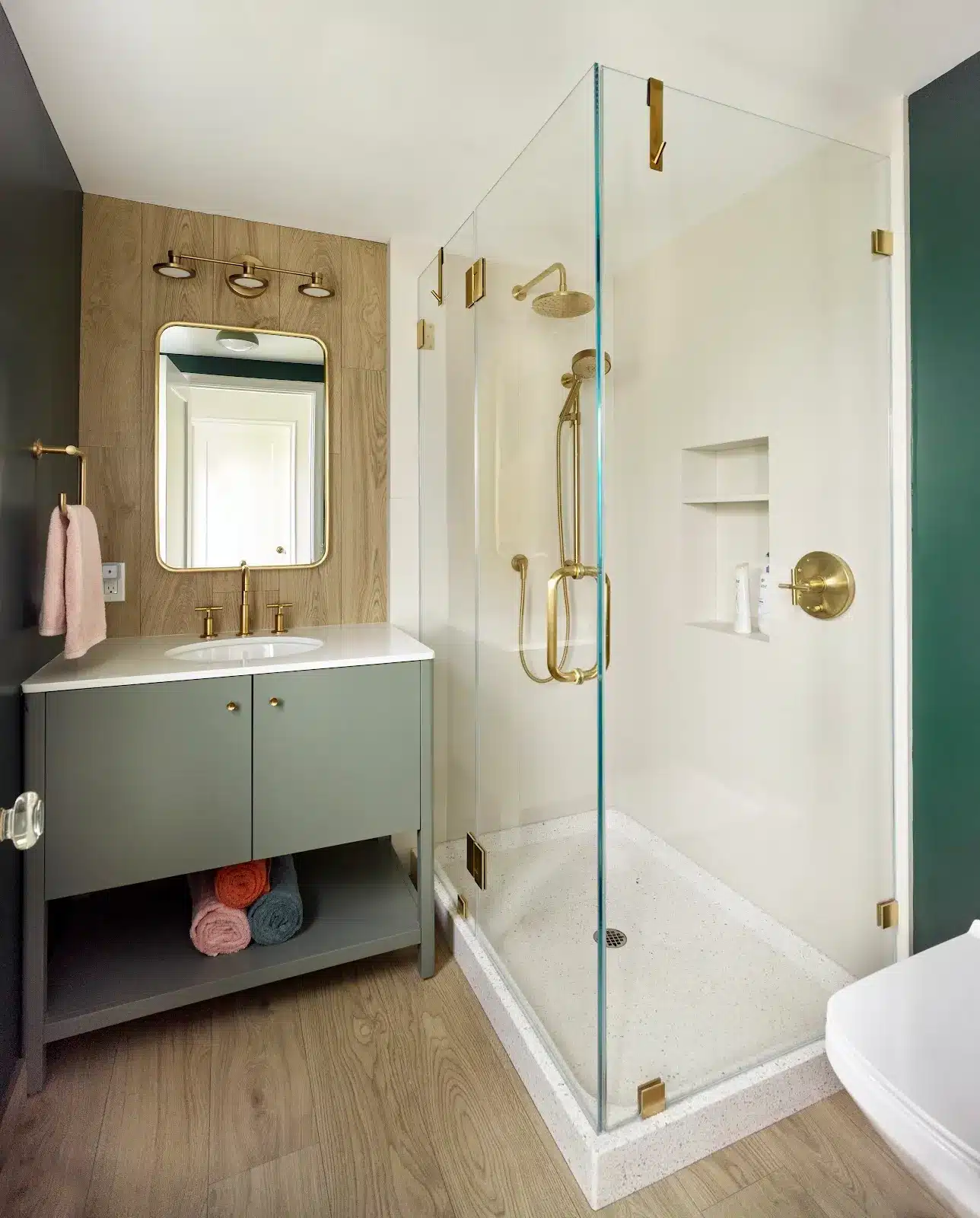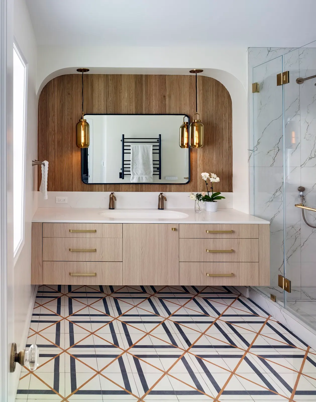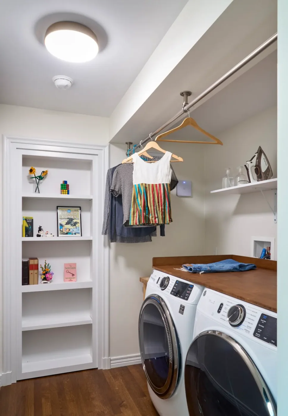We transformed the single upstairs bathroom into a master and a second bathroom, reclaiming space from an adjacent dressing room and hallway to make the master bath a generous size. Downstairs an existing bathroom was remade into a full bath and laundry room, and a guest room was added behind a hidden bookcase door in the laundry room.